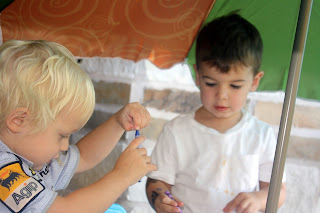 | LJ was so excited that Bear was still there when he woke up from his nap... more coloring and playing while grilling dinner outside! |